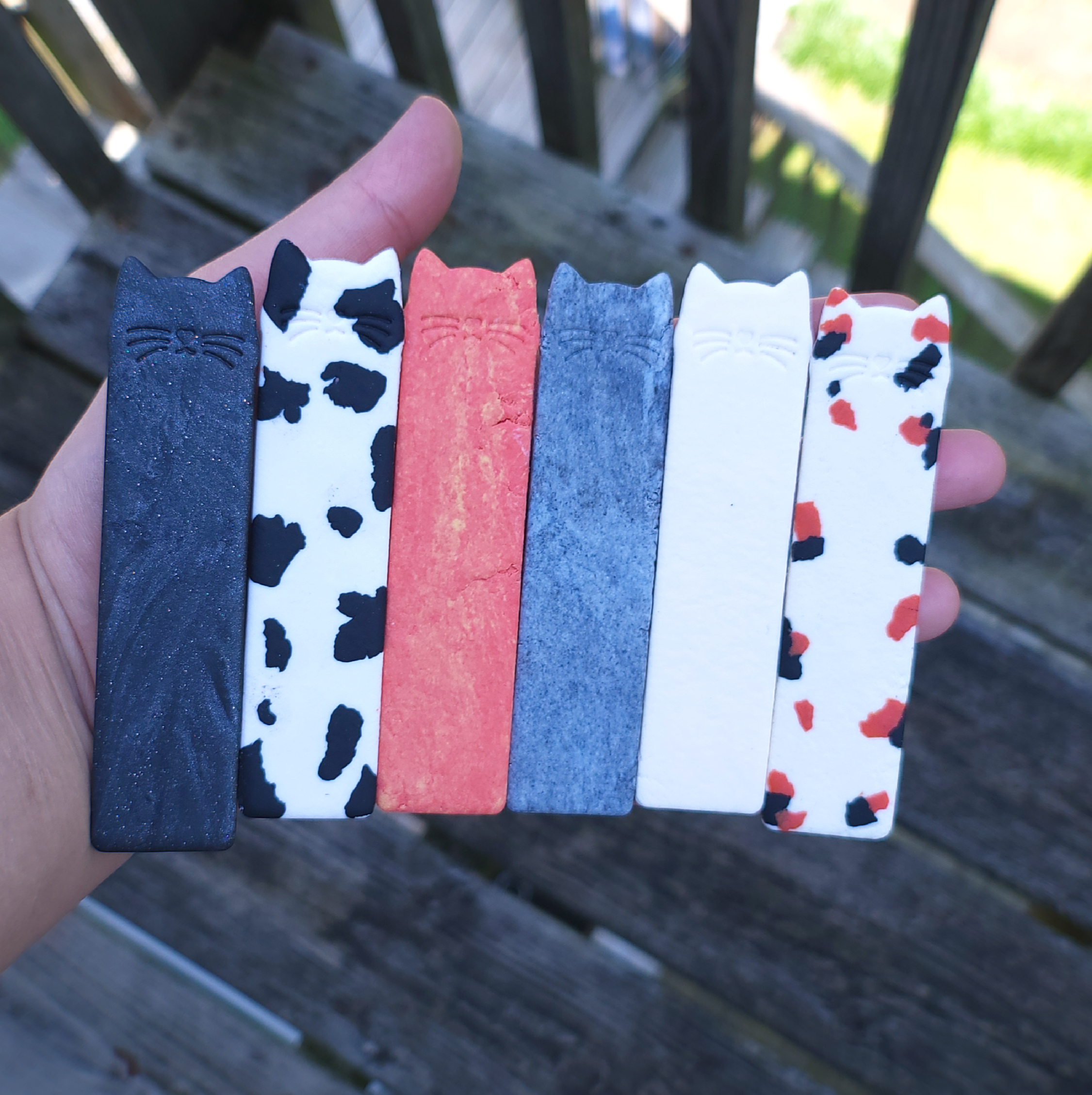 Flexible, thin bookmarks made from polymer clay that will bend but not break and keep your page purrfectly!